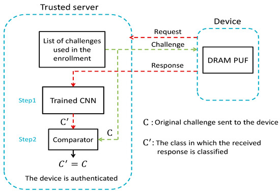 Figure 4 shows the authentication procedure as well as the major parts of server and device. In each authentication request from the PUF device, the server sends one of the challenges (prearranged class labels) to the device to configure a particular DRAM block as a PUF. Next, the device generates the corresponding response and sends it to the trusted server. Then, the server authenticates the device in two steps: