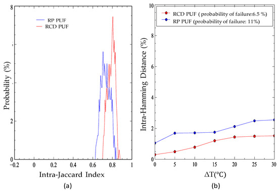 (a) Distributions of intra-Jaccard indices calculated between responses for tRCD and tRP PUFs. (b) The average intra-Hamming distance (HD) for tRCD and tRP PUFs with different temperatures (reference temperature is 25 °C).