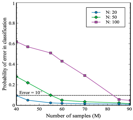 Probability of error in classification as a function of the number of measurements for the different number of classes (N = 20, 50 and 100).