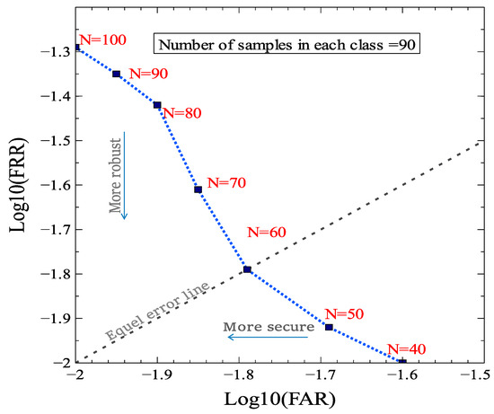 The security and robustness of authentication mechanisms are generally measured using two popular metrics: the false acceptance rate (FAR) and the false rejection rate (FRR). Generally, these two undesirable errors are defined considering the major PUF properties (intra-HD and inter-HD), and there is a tradeoff between them which can be controlled by a threshold for obtaining a suitable FAR and FRR [33]. The threshold is determined by effective parameters depending on the application. In this paper, FAR refers to the probability that a wrong response is verified as the true response from the target device and FRR is the probability of wrongly rejecting the target entity’s response. Based on the proposed authentication mechanism, the classification of received response is a major stage in accepting or rejecting it. When the server sends a challenge to the target device, the probability that the corresponding response is rejected directly depends on the result of classification of the response, which is compared to the original class in the next stage. Thus, the accuracy of classification significantly affects the FRR, and the probability of misclassification determines the FRR. However, the FAR value is not directly influenced by the rate of classification error and depends on CNN features. Assuming that a wrong response from an invalid device is received, it can be classified in each class with the same probability due to the uniqueness of PUF responses generated by different DRAM blocks. Therefore, the FAR is about 1/N, where N indicates the number of classes of the trained CNN. In Figure 8, the values for the FAR and FRR for deep PUF are shown and compared to some other PUFs. The threshold used for controlling the tradeoff between FAR and FRR can be determined by the number of classes. With a smaller number of classes (N = 60), the FAR and FRR achieve an equal value (0.016), but as N increases, the FAR and the accuracy of classification decrease leading to a higher FRR. However, the dependence of accuracy on other features (e.g., number of samples in each class and CNN model) can address this issue and enable a desirable FRR. In such a scenario, it will be possible to minimize both the FAR and FRR considering the major features, such as increasing the accuracy and the number of CNN classes simultaneously.