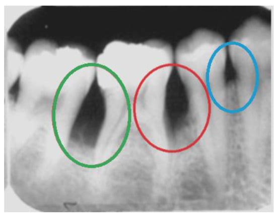 Examples of bone loss in a real periapical radiograph: an interproximal crater in green, vertical bone loss in red, and a horizontal bone defect in blue.