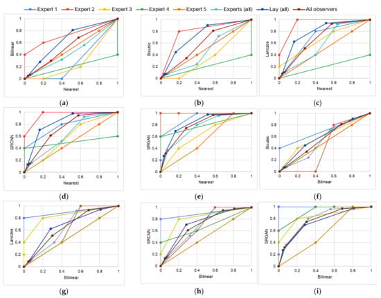 In this work, we considered fifteen MA–MB pairs: nearest–bilinear, nearest–bicubic, nearest–Lanczos, nearest–SRCNN, nearest–SRGAN, bilinear–bicubic, bilinear–Lanczos, bilinear–SRCNN, bilinear–SRGAN, bicubic–Lanczos, bicubic–SRCNN, bicubic–SRGAN, Lanczos–SRCNN, Lanczos–SRGAN, and SRCNN–SRGAN. For each MA–MB pair, a total of eight VGC curves were obtained: one for each expert, one considering the scores assigned by all five experts, one considering the scores assigned by all lay participants, and one considering all participants (experts and lay).