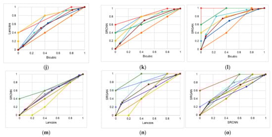 The VGC curves obtained for each MA–MB pair are shown in Figure 5. They are represented by the plots (a)–(o), where: (a) nearest–bilinear, (b) nearest–bicubic, (c) nearest–Lanczos, (d) nearest–SRCNN, (e) nearest–SRGAN, (f) bilinear–bicubic, (g) bilinear–Lanczos, (h) bilinear–SRCNN, (i) bilinear–SRGAN, (j) bicubic–Lanczos, (k) bicubic–SRCNN, (l) bicubic–SRGAN, (m) Lanczos–SRCNN, (n) Lanczos–SRGAN, and (o) SRCNN–SRGAN. Each color in these plots represents one observer or group: general VGC curves in maroon, VGC curves for all experts in light blue, curves for lay participants in dark blue, expert 1 in medium blue, expert 2 in red, expert 3 in yellow, expert 4 in green, and expert 5 in orange.