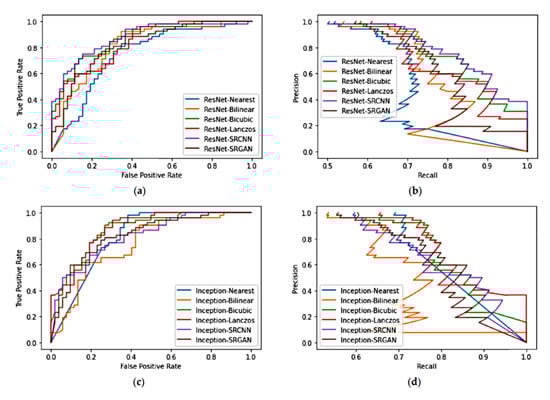 Table 8 shows the proportion of correctly classified examples (test accuracy) for each method. Figure 6 shows the receiver operating characteristic (ROC) and precision-recall (PR) curves for each model. Figure 6a shows the ROC curves for ResNetNearest, ResNetBilinear, ResNetBicubic, ResNetLanczos, ResNetSRCNN, and ResNetSRGAN; and Figure 6b shows their PR curves. Similarly, Figure 6c shows the ROC curves for InceptionNearest, InceptionBilinear, InceptionBicubic, InceptionLanczos, InceptionSRCNN, and InceptionSRGAN; and Figure 6d shows their PR curves.