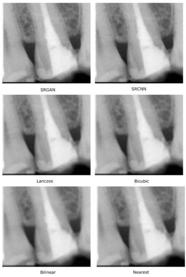 Recently, deep-learning-based methods have been proposed to achieve high-resolution images with better quality [21,22,23,24,25,26]. Moreover, some of these methods, specifically the super-resolution convolutional neural network (SRCNN) and the super-resolution generative adversarial network (SRGAN), have also been employed to periapical images in previous work [21].