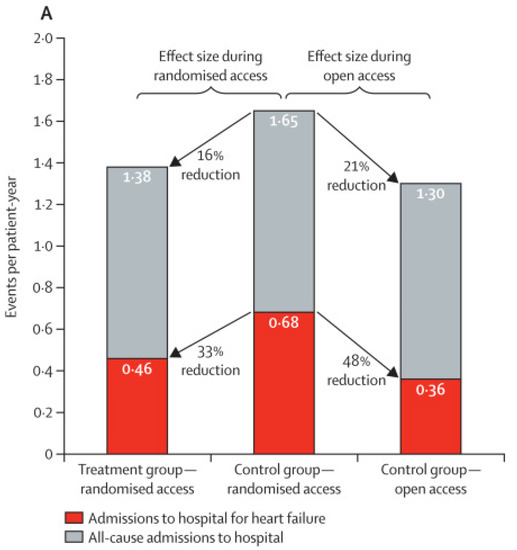 Effect of pulmonary artery pressure-guided heart failure management on (A) hospital admission rates and (B) on combined rates of hospital admissions and mortality. Reprinted from The Lancet, Volume 387, Issue 10017, Abraham et al., Sustained efficacy of pulmonary artery pressure to guide adjustment of chronic heart failure therapy: complete follow-up results from the CHAMPION randomised trial, Pages 453–461, Copyright 2016, with permission from Elsevier [25].