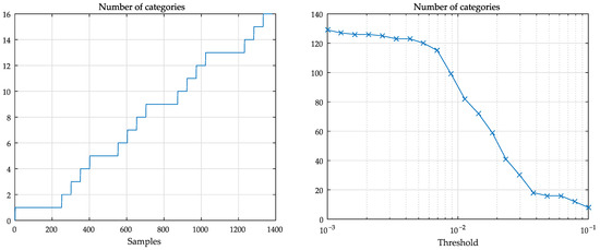Figure 3 (right) also illustrates the typical dependence of the number of categories S according to the threshold , as a result of the procedure described in Section 4.2. As the number of categories is ultimately determined by the threshold , it is recommended to perform an intermediary step to optimize the threshold value. A brief analysis of this issue can be found in Section 5.9.