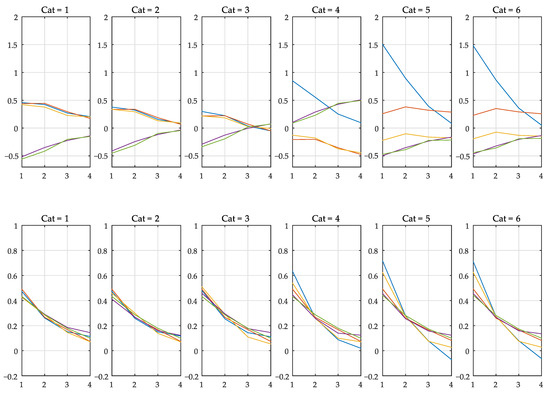 At the end of the procedure, a dictionary with all and is produced. As an example, Figure 5, gives the first six sets of weights (first row: ; second row: ). It is possible to notice, even visually, that segments 1 and 2 are similar, as well as Segments 5 and 6. This justifies the possible need for a clustering procedure on the set of filter coefficients at the end of the training phase. Alternatively, it is possible to use robust techniques with the objective of avoiding point anomalies that may unnecessarily increase the number of mappings.
