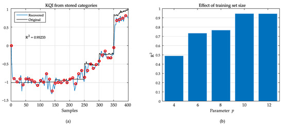 Recovered KQI from at left (a). Black: original data; blue: recovered KQI. Red dots are samples used for testing, not present in the training data. At right (b), the effect of the size of the training set in .