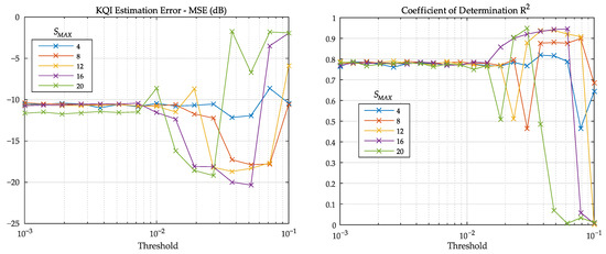 Figure 9 depicts results using LMS filtering. In this example, we set to obtain the graph at the left, where it is possible to verify that the reconstructed signal follows the changes of the original KQI used for training. The coefficient of determination was used to evaluate the algorithm’s performance. This figure of merit measures how much the variance of a dependent variable (i.e., the estimated KQI) can be predicted from an independent one (i.e., the measured KQI). This is a widely extended measure to quantify the quality of regression mechanisms [31]. absolute values are defined in the range , where a value of one implies a perfect fit.