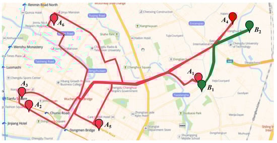 In this paper, Spatiotemporal Mobility (SM) is used to denote the user’s attributes with respect to the number of stopovers and the average moving speed of the user. The stopovers include the supermarket, the park, the community, or any locations the user may visit. The attacker can still distinguish the trajectory in the anonymity set through the SM. Figure 1 shows two users’ moving trajectories in one day. The trajectories colored in red and green belong to Alice and Bob, respectively. The stopovers of Alice are distributed over multiple locations in the region. Her average moving speed is comparatively high. It is easy to speculate that her daily movement pattern is irregular and unfixed. On the contrary, the stopovers of Bob only distribute in two locations. He has fewer stopovers than Alice. His average moving speed is lower. It is speculated that his daily movement pattern is likely to be more regular and fixed. It is concluded that the mobility of Alice is higher than Bob. If the trajectory -anonymity set submitted by Bob contains a trajectory generated by Alice, once the attacker knows Bob is an employee of a company through data mining techniques, this trajectory with high mobility in the anonymity set will be easily filtered out.