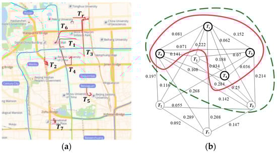As shown in Figure 3a, the initial trajectory candidates map is constructed by a real trajectory and seven historical trajectories , , , , , , . The number of stopovers and the average moving speed of these trajectories are listed in Table 2, where the SM of each trajectory is computed by Equation (2). The parameters are set as , , . Equation (3) is used to calculate the SM difference between trajectories. The weight matrix of the eight trajectories is obtained as follows: