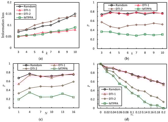 Figure 4a shows the information loss comparison between these four algorithms with increases when , , . As shown in Figure 4a, the information loss of the four algorithms decreases when increases. For the same , the information loss of the random algorithm and the DTI-2 algorithm are relatively high. The information loss of the DTI-1 algorithm and the MTPPA algorithm are similar, but both of them are relatively lower than the random algorithm and the DTI-2 algorithm. This is because the DTI-1 algorithm essentially does not consider the similarity between trajectories. The -anonymity set generated by the MTPPA algorithm contains the user’s real trajectory and − 1 historical trajectories. The queried results contain the query results of the user’s real location in each query. Therefore, the MTPPA algorithm and the DTI-1 algorithm have the lower information loss, which results in better data availability.