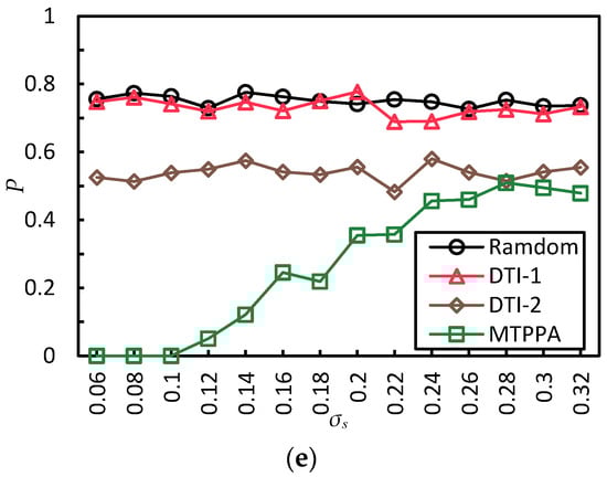 Figure 4b shows the trajectory privacy disclosure probability comparison between these four algorithms with increases when , , . As shown in Figure 4b, the trajectory privacy disclosure probability of the four algorithms remains unchanged. For the same , both of the trajectory privacy disclosure probability of the Random algorithm and the DTI-1 algorithm are relatively high. The trajectory privacy disclosure probability of the DTI-2 algorithm is lower, and that of the MTPPA algorithm is lower than that of the DTI-2 algorithm by 37%. This is because the random algorithm and the DTI-1 algorithm essentially do not consider the similarity between trajectories. Therefore, the random algorithm and the DTI-1 algorithm have a high probability of privacy disclosure. The DTI-2 algorithm considers the similarity between trajectories, but it does not guarantee the final -anonymity set is a similar trajectory set. The MTPPA algorithm guarantees the final -anonymity set is a similar trajectory set. Therefore, the MTPPA algorithm has the lowest trajectory privacy disclosure probability.