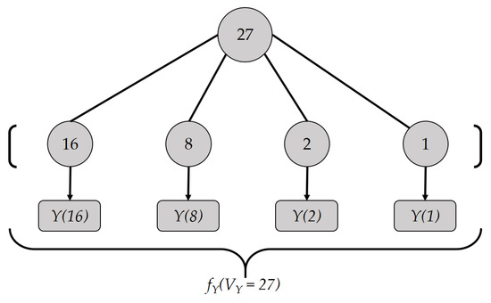 In this subsection, we describe the encoding method Y that is used in as a subroutine to encode the individual terms of . In some cases, encoding for 0 may be required. Therefore, the input to Y is either 0 or a power of 2. Let D be an integer that satisfies . Y is a one-hot encoding method and outputs a D-dimensional vector for a predefined value D. The elements of an output vector are either 0 or 1. If , it can encode the following values: { 0, , , , , , , }. To calculate all the elements of the vector, we compute the target index position p. If the input to Y is 0, then . When , the target index is . Then, the pth vector element is set to 1, and all the other elements are set to 0. The detailed task of Y is depicted in Algorithm 1. For example, when and , Y produces :