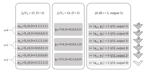 Figure 3 illustrates an example of Algorithm 4 with and . As the vector dimension is , we need six vectors for and three vectors for . The figure shows which vectors are used to compute r for each iteration . As and are decomposed as and , they tie for and . The first appears in line 5 when . The algorithm outputs 1, indicating that .