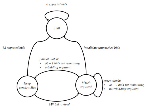 We adopt Algorithm 5 (INSERT procedure) from [13], which has been used to insert a new bid element into . The INSERT procedure calls COMP as a subroutine to sort the elements and restore the heap. Insertion of a new bid element into is performed by changing line 6 of Algorithm 5 as . Heaps are implemented as a typical complete binary tree such that the root node is at . The parent node of is at , and its left and right children are at and , respectively. We also adopt the REMOVEMIN() procedure from [13] to remove the minimum, i.e., the root element of the heap . Finally, we also adopt Algorithm 6 (MATCHING procedure) from [13] to find a possible match.