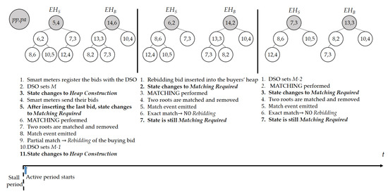 The blockchain receives the encrypted bid values from the smart meters. It maintains an encrypted priority queues and performs secure matching of the bid values by repeating the secure comparison on encrypted bid vectors, i.e., Algorithm 4 is performed repeatedly on encrypted vectors for and . The details of this process are explained in the next subsection.