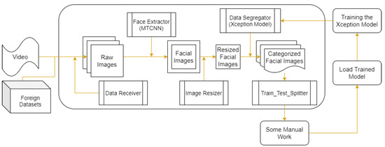 The FIT machine [21] from Figure 1 coverts a recorded video clip or any foreign datasets into facial images as a part of our desirable FER training and testing datasets. In other words, once a downloaded YouTube video clip or any foreign datasets enter the FIT machine, the FIT machine starts to convert from a video as an input into the cropped, resized, and categorized facial images as the output. The FIT machine consists of the data receiver, the face detector as the MTCNN, the image resizer [22], and the data segregator as the pre-trained Xception algorithm model [23].