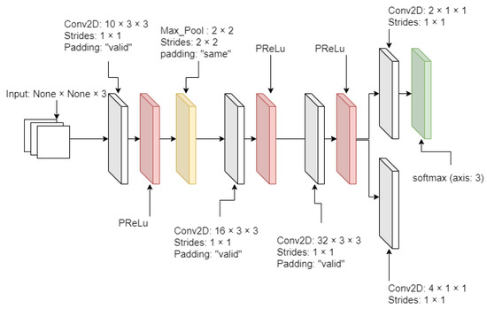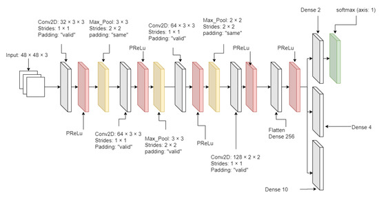 From Figure 2, Figure 3 and Figure 4, MTCNN has P-Net, R-Net, and O-Net. During the face detection, the input image enters P-Net, and R-Net takes P-Net output. O-Net takes the output from R-Net at the end. From P-Net through O-Net, the MTCNN algorithm is getting more complicated and has deeper layers. The number of layers and parameter computation is increased during the process of face detection. All sample images are supposed to enter through these networks to generate the best-detected faces. First, the different-generated-sized input images enter P-Net. P-Net initially chooses the possible face frames from the given input images. R-Net inspects the given initial frames from P-Net, then it removes the face frames specifically which do not meet a threshold score. Finally, O-Net chooses the best face frames from the given output from R-Net. The binary cross-entropy loss from Equation (1) is used to train the MTCNN and is expressed as