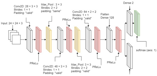 In addition to the structure of MTCNN, all activation layers are used by the parametric rectified linear unit (PRelu), which is an improved version of the traditional rectified linear unit (ReLU) or the leaky-ReLU. The PReLU can adjust the slope as a training parameter. The PReLU equation is described as