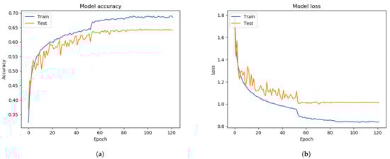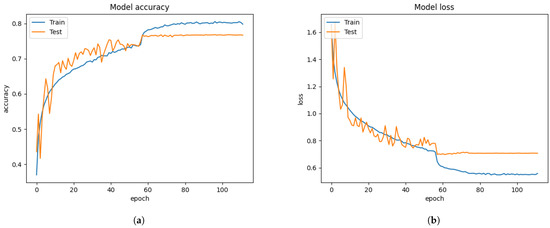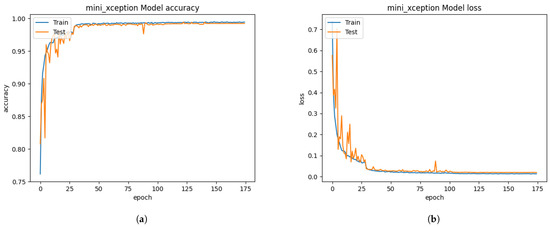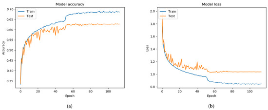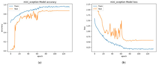 In this subsection, all different FER datasets are demonstrated and showed the performance of the Xception algorithm [23]. The epoch variable was 150, and the variable value of the patience was 50. In other words, the training progress of the Xception algorithm stops when no further improvement of validation loss occurs 50 times. The graphs from Figure 6, Figure 7, Figure 8, Figure 9, Figure 10, Figure 11 and Figure 12 demonstrate the Xception algorithm training process within the given individual FER dataset.