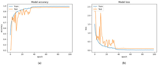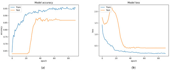 The performance results from the CK+ dataset, which extracted only facial segments from the FIT machine. (a) model accuracy (b) model loss.
