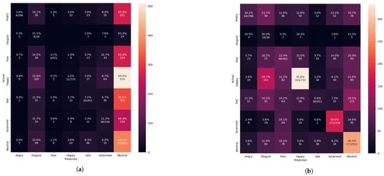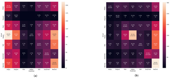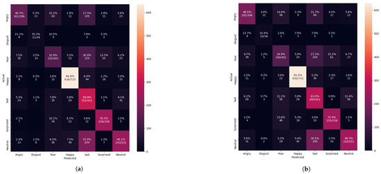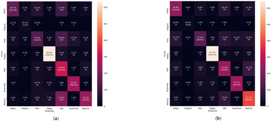 Evaluating the pre-trained Xcepetion algorithm after training with only the FER 2013 dataset. (a) Confusion matrix evaluation before applying with the FIT machine. (b) Confusion matrix evaluation after applying with the FIT machine.