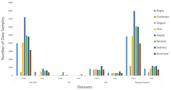Generally, relying on obtaining datasets without any rigorous inspection could cause the trained model to become disoriented by some malicious data inputs. Some images were not relevant to facial images or misplacing them into the wrong labeled directories. Removing irrelevant facial images from the FER 2013 dataset must be done to reduce unnecessary computation. Considering the number of available facial images in the dataset, removing any facial images reduced the amount of available training and testing datasets and caused an imbalanced number of each directory’s facial images. We merge with different existing datasets or collect the additional datasets to have the additional facial images for training and testing to substitute the removed facial images. Merging the different existing datasets requires a unique pre-processing technique because all datasets have different sizes or different positions of facial images on a massive scale.