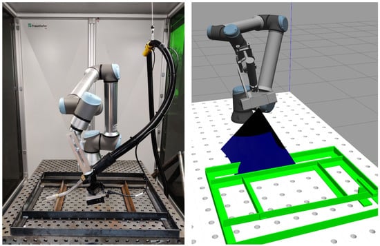 The experimental setup consists of a collaborative Universal Robots UR10e robot equipped with an Ensenso N35 3D sensor as an endeffector. The UR10e possesses six degrees of freedom, a reach of 1300 mm, and a pose repeatability of ±0.05 mm. Ensenso N35-606-16-BL is a 3D stereo projection sensor using blue light. It has a clearing distance (CD) of 312 mm and a working distance (WD) of up to 464 mm. The sensor has a resolution of 1280 × 1024 Pixel (1.3 MP) and a focal length of 6 mm. This corresponds to a spatial (x-y) resolution of 0.383 mm/pixel at a WD of 400 mm. The z-axis accuracy of the Ensenso N35 at 400 mm WD is 0.192 mm. Figure 1 illustrates the hardware setup in real-world and its simulated equivalent.