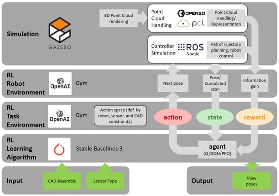 Figure 2 shows the overall architecture of the simulation and Reinforcement Learning environment. The framework builds on top of the OpenAi ROS toolkit []. Starting at the lowest layer, we choose Gazebo [] as simulation software due to the existing feature of rendering realistic 3D stereo camera data and its close link to the ROS Noetic middleware. Other robot simulations as MuJoCo, Blender, CoppeliaSim, or Webots either lack in point cloud rendering or in less developed ROS support. The common controller plugins of ros_control [] executes planned robot paths to view poses on the robot and can seamlessly switch between real-world and simulation.