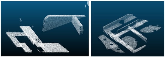 The point cloud rendering is based on the velodyne_simulator ROS package (https://bitbucket.org/DataspeedInc/velodyne_simulator, visited on 25 January 2021) and supports Gaussian noise and GPU acceleration. Figure 3 illustrates its realism. Since Gazebo simulates a hardware interface to the ROS robot driver (in our case, Universal Robots), superior layers work independently of choosing a real robot or its simulated counterpart. The same applies to the Gazebo sensor simulation and the Ensenso ROS sensor driver. Further point cloud processing and semantic evaluation is based on Point Cloud Library (PCL) [] and Open3D [] as described in Section 2.3.2.