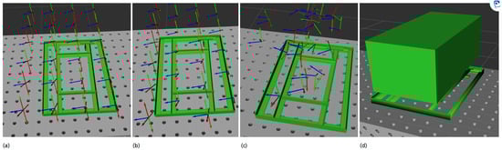 To deploy grid-like structures in case of a discrete action space (see Section 2.3.3, Equation (3)), the step sizes and in x and y direction are set to 0.2 m. Due to the small working range of the simulated Ensenso N35 sensor, the sensor height is equal to 0.3 m, i.e., . Since rotation around the x-axis results in negligible changes of the resulting point cloud, the roll angle R remains fixed . The pitch angle is set to a fixed value of . The step size of the yaw angle is set to starting from , such that the action space considers four different yaw angles . The resulting grid contains 36 positions with four different orientations at each position, making up a total of 144 view poses for both triangle and square grids.