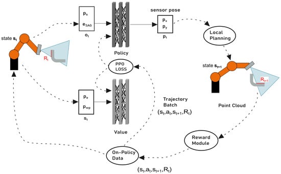 Finally, we integrated PPO [] as an RL approach that is applicable on continuous action spaces. Figure 5 illustrates the structure of the PPO approach to view planning and is now explained in detail.