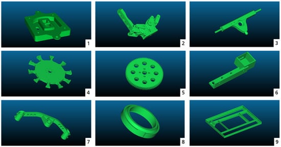 An illustration of the test workpieces used in our experiments. Each of them is part of the ABC Dataset [], except for the custom workpiece number 9.