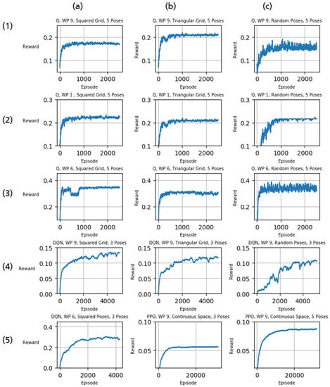 To evaluate the presented method, we approached the VPP using three different algorithms. First, we applied Q-learning along the lines of [,]. Second, we deployed DQN [] on a similar discrete pose set and PPO [] using a continuous state/action space.