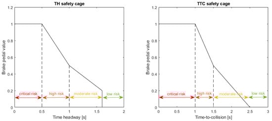 where is the minimum braking value from the TH safety cage, is the minimum braking value from the TTC safety cage, and is the current braking value from the RL agent.
