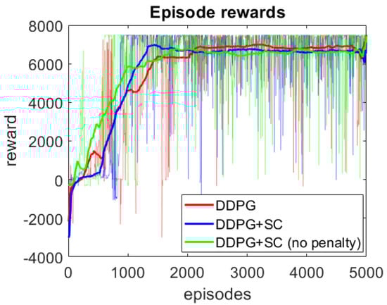 The episode rewards during training can be seen in Figure 4, where three models are compared. The three models are DDPG only, DDPG+SC which is DDPG with safety cages, and DDPG+SC (no penalty) which is the DDPG with safety cages but without the penalty. As can be seen, the DDPG+SC model has lower rewards at the beginning of training as it receives additional penalties compared to the other two models. However, after the initial exploration the DDPG+SC is the first model to reach the optimal rewards per episode (∼7500 rewards), demonstrating improved convergence. Comparing the DDPG+SC models with and without penalties from the safety cages shows the model with the penalties converges to the optimal solution sooner, suggesting the penalty improves convergence during training. An additional benefit of the safety cages here is the safety of exploration, as the DDPG model collided 30 times during training, whilst the DDPG+SC model had no collisions during training. However, it can be seen that all three models converge to the same level of performance, therefore no significant difference in the trained policies can be concluded from the training rewards alone.