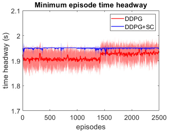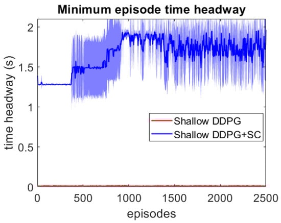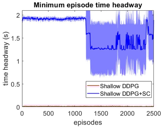 As this lead vehicle used in the adversarial testing can behave very differently to those seen during training, this testing focuses on investigating the models’ generalisation capability as well as their response to hazardous scenarios. Each DDPG model is tested under two different velocity ranges; the first limits the lead vehicle’s velocity to the same as the training scenarios with m/s, and the second uses a lower velocity range which enables the ATF to expose collisions more easily at a velocity range of m/s. For each model, 3 different adversarial agents were trained, such that results can be averaged between these 3 training runs. The minimum episode TH during training can be seen for both deep models over the 2500 training episodes in Figure 6 and Figure 7. These tests show that both deep models can maintain a safe distance from the lead vehicle even when the lead vehicle is attempting to cause collisions intentionally. Although a slight difference in the two models can be seen, as the DDPG+SC model has a slightly higher headway on average as well as significantly less variance. However as both deep models remain at a safe distance from the adversarial agent, these models can be considered safe even in safety-critical edge cases. Comparing the two shallow models in Figure 8 and Figure 9, a more significant difference can be seen. While both models are worse in performance than the deep models, the Shallow DDPG is significantly easier to exploit than the Shallow DDPG+SC model. The Shallow DDPG model continues to cause collisions during the adversarial testing, whilst the Shallow DDPG+SC model remains at a safer distance. In the training conditions, the Shallow DDPG+SC remains relatively safe, with no decrease in the minimum headway during the training of the adversarial agent, although it can be seen that the variance increases as the training progresses. In the lower velocity case, the Shallow DDPG+SC still avoids collisions, but the adversarial agent is able to reduce the minimum headway significantly better. This shows that the safety cages have helped the model learn a significantly more robust control policy, even when the model uses sub-optimal parameters. Without the additional weak supervision from the safety cages, it can be seen that these shallow models would not have been able to learn a reasonable driving policy. Therefore, the weak-supervision by the safety cages can be used to train models with sub-optimal parameters. In addition, for models with optimal parameters they provide improved convergence during training and slightly improved safety in the final trained policy.