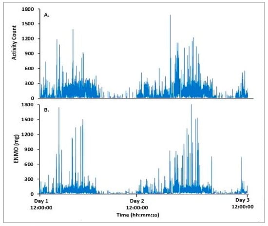 Spearman’s rank-order correlation coefficient [74,75] was used to assess the temporal relationship between activity counts from the Actiwatch 2, and ENMO from Verisense because the data were not normally distributed. In accordance with a well-documented scale for medical research, we considered correlations of 0–0.3 as negligible correlation, 0.3–0.5 as low correlation, 0.5–0.7 as moderate correlation, 0.7–0.9 as high correlation, and 0.9–1.0 as very high correlation. A p < 0.05 was considered statistically significant for all analyses [76].