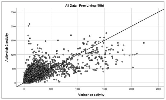 Epoch-by-epoch absolute activity of Actiwatch 2 and Verisense as recorded from all subjects over 48 h (163,759 data points).