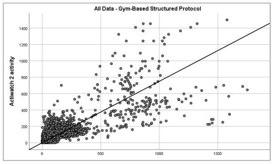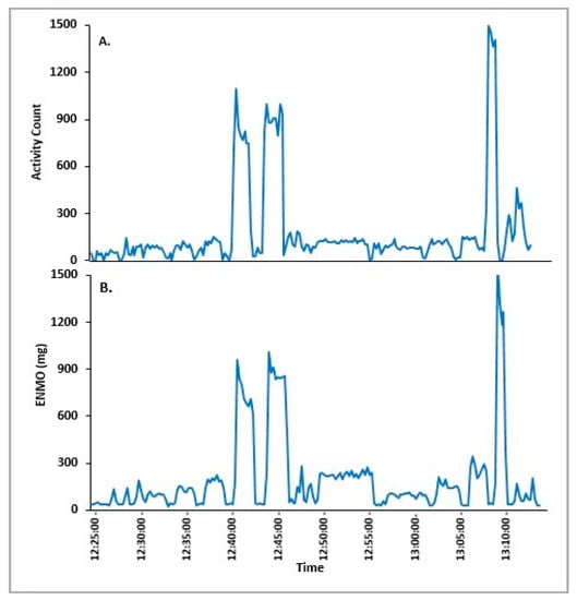 Epoch-by-epoch data obtained from both the Actiwatch 2 and Verisense sensors were compared over the gym-based SP from 12 participants. The overall patterns observed between the Actiwatch 2 and Verisense appear to be visually quite similar for the gym-based SP study (Figure 4 and Figure 5). Within participants, gym-based SP activity for the Actiwatch 2 and Verisense sensors were also highly correlated (r = 0.78 ± 0.05, range: 0.72–0.88, n = 12; Spearman correlation).