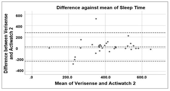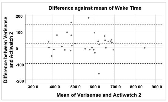 To examine the possibility of systematic bias in overall sleep parameter scoring, Bland–Altman plots were generated to visually inspect the level of agreement between Verisense and Actiwatch 2 results (Figure 6, Figure 7 and Figure 8). For sleep time, wake time and TST, the spread of the differences visually appears to be even, with no bias in overestimation or underestimation of sleep, wake or TST.
