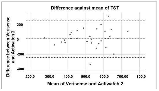Bland–Altman plot of TST estimated by Verisense as compared to Actiwatch 2.