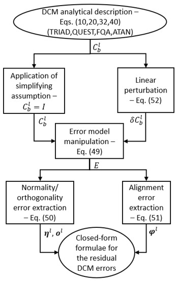 After analytically solving (52), for each alignment method, the result, substituted in (49), and then in (50) and (51), can be used to produce novel closed-form formulae for the DCM residual normality, orthogonality, and alignment errors. Unfortunately, for the purpose of the error analysis herein proposed, an arbitrary orientation of the body frame w.r.t. the navigation frame produces closed-form formulae which are overly complicated and not readily amenable to physical interpretation. For simplification purposes hence, hereinafter, we will assume that body and navigation frames are aligned. Figure 1 summarizes the main steps involved in the process of deriving the closed-form formulae for the residual DCM errors for each investigated AHRS stationary alignment method.