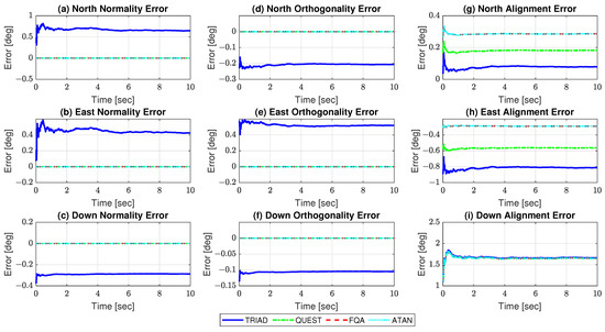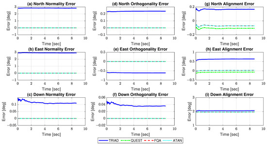 As can be seen, the estimated errors nicely agree with the predicted ones (confidence intervals experimentally obtained in Table 2 encompass the predicted values in Table 1), which validates the proposed error analysis. Figure 2a–f, in particular, indicate that only TRIAD develops normality and orthogonality errors in the computed DCM (as expected). Figure 2g,h, in turn, demonstrate that, while FQA’s and ATAN’s north and east alignment errors are only corrupted by accelerometer errors, those from TRIAD and QUEST also depend on magnetometer biases, as well as on gravity and Earth magnetic field model errors. In the specific case of QUEST, the north and east alignment errors are found to be further dependent on . Lastly, Figure 2i evidences that, as predicted, no difference exists, in terms of accuracy, between the down alignment error developed in TRIAD’s, QUEST’s, FQA’s, and ATAN’s computed DCM.