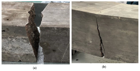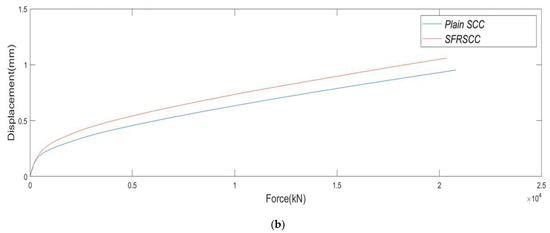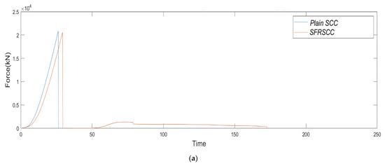 Figure 3 shows two different plots obtained from the three-point bending tests of plain SCC and SFRSCC beams. Figure 3a presents the force–time curves for the force measured by the loading cell at mid-span deflection, while Figure 3b shows the displacement-force curves for assessing the effect of fibre addition on the elasticity of SCC. As expected, the load-displacement curve is linear up to the maximum load for all specimens. As seen in Figure 4a, the behaviour of the plain SCC beam is typical for a brittle material with a linear force–time curve. The beam fails in tension with the crack initiating from the bottom surface and propagating towards the top, splitting it into two parts. Once the maximum load is achieved, any additional load will lead to the formation of the macrocrack and suffer a catastrophic failure [23,50].