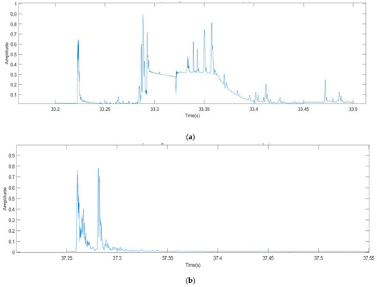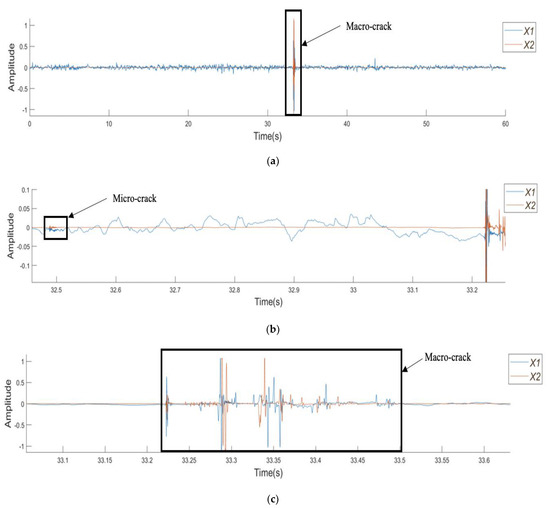 Figure 5a shows the amplitude–time curves obtained from the plain SCC beam with a clear notation showing the macrocrack. In addition, Figure 5b shows the microcrack at 32.5 s as a distinctive change in the behaviour during the test with a burst of energy shown by the increase in density of low amplitude peaks when compared to the surrounding data points. Figure 5c takes a closer look at the macrocrack, highlighting what was assumed to be a single distinct event to be at least four discrete events of varying duration, which is suggestive of multiple breaking or tearing events.