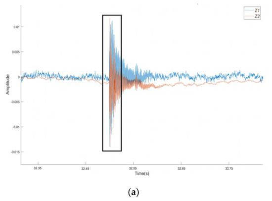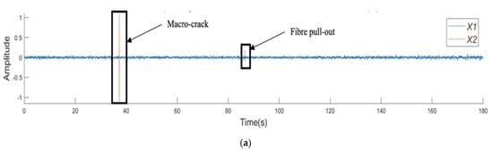 In this section, filtered response data from three plain SCC beams and three SFRSCC beams were analysed. Further in-depth analysis of the results was then manipulated for a single plain SCC and SFRSCC in a variety of methods. The chosen beams have typical results to their equivalents. It is also worth noting that X1 and X2 in Figure 5, Figure 6, Figure 9, Figure 10, and Figure 11, represent the responses obtained from accelerometers 1 and 2, respectively. The benefit of using two triaxial accelerometers is that the specific crack location can be confirmed. The point of intersection, where the released energy from the source of the crack, captured by the two accelerometers, can be determined by a simple trigonometry, is discussed in Section 3.2.3.