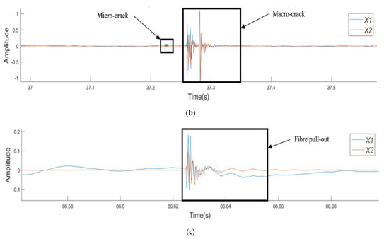 In addition, the time–amplitude curves could also be used with the time to determine the crack type. Microcracking has a relatively small amplitude, which occurs prior to the macrocrack and has no visible precursors. The macrocrack had the clear precursors of microcracking; notably the fibre pull-out events had no detectable precursors and occurred after the macrocrack.